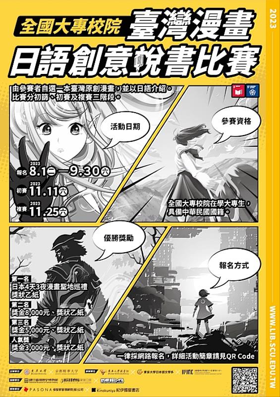 (中央社訊息服務20230801 10:09:56)國內首創以日語來介紹臺灣漫畫的說書比賽於今(8/1)日開放報名,歡迎會說日語,喜歡漫畫的全國大專生踴躍參加。