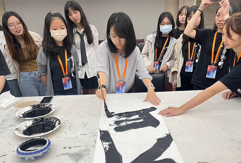 此外,會議休息期間,長榮大學書畫藝術系亦安排大三李易同學及領隊江柏萱老師在論壇交流過程中,進行「現場揮毫」示範,藉以展現長榮大學在「書畫藝術」教學的努力與學習成果,深獲在場兩岸青年學子及藝術界人士讚嘆不已,並給予高度的肯定。