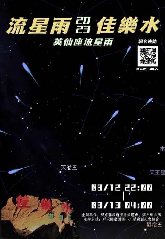 今年英仙座流星雨從7月17日開始活躍至8月24日,而8月13日午夜至黎明時段將會是該流星雨達到極大期,且不受月光干擾,是近年觀賞英仙座流星雨條件最佳的機會。為讓大家欣賞到這樣的天文奇觀,縣府與滿州鄉公所特別合力來主辦十年難得一遇的天文觀星活動,報名活動自8月4日下午7點公告於網站限量200名額,不到24小時即滿額,為讓更多追星族能參與這次活動,縣府決定再於8月8日下午3時後,再開放新增100個名額,名額數量有限,舉起您的快刀手。