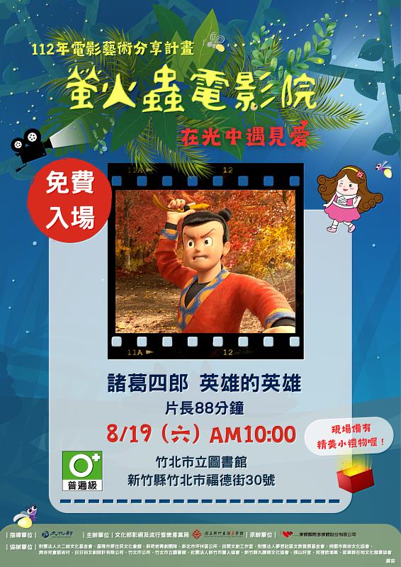 (中央社訊息服務20230816 10:47:33)由文化部指導,文化部影視及流行音樂產業局與國立新竹生活美學館共同主辦「電影藝術分享-螢火蟲電影院」計畫,於北台灣巡迴放映優質國片,8月19日(六)第3場次將於竹北市立圖書館2樓閱覽室,精彩上映「諸葛四郎-英雄的英雄」動畫影片。