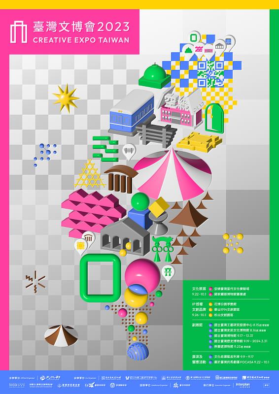 2023年臺灣文博會即將於9月22日至10月1日開展,文化部今(16)日公布主視覺,設計師馮宇以『呼應全民參與、打開多元精神』為主題,運用立體圖像設計出代表展會場館、內容及精神的24個元素,並組成臺灣圖樣。文化部長史哲表示,2023年臺灣文博會重返臺北,除了將擴大串連臺北市5個文化場域,更將首次突破單一縣市,延伸至全臺博物館辦理,期盼讓臺灣文博會能真正向全國「打開」,匯聚出全臺灣最繽紛多元的文化創意。