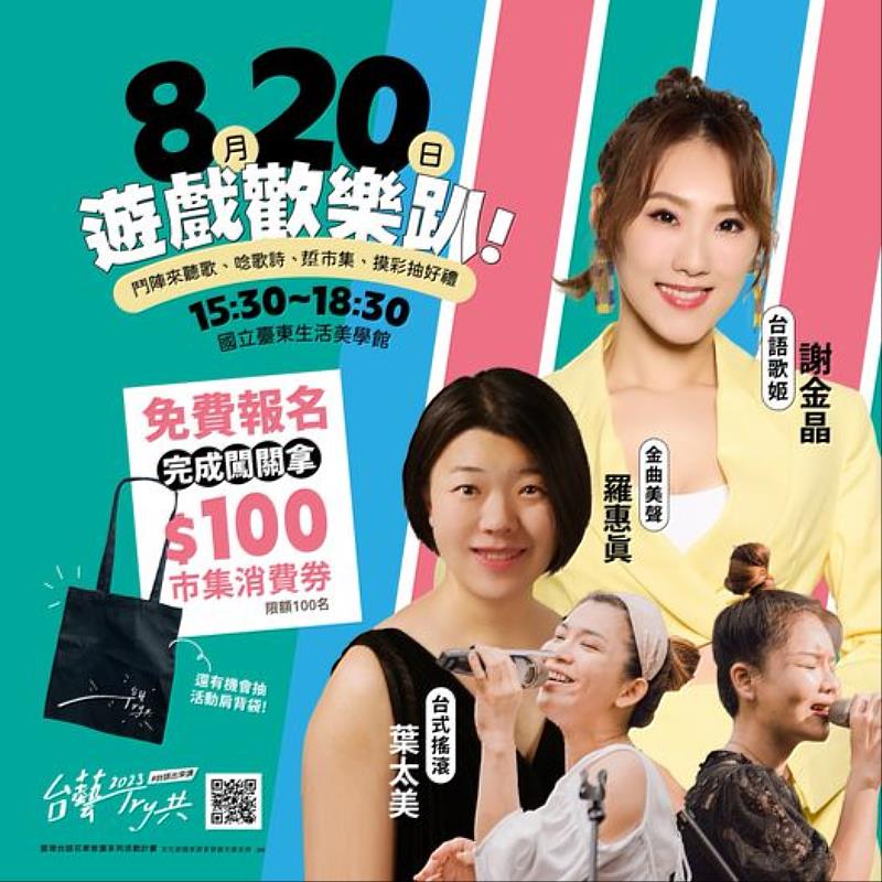 (中央社訊息服務20230816 14:52:41)由文化部國家語言整體發展方案支持的《台藝Try共:2023臺灣台語花東推廣系列活動》將於8月20日(星期日)在國立臺東生活美學館盛大開幕,現場邀請豬哥亮的么女,台語歌手謝金晶演唱多首台語歌曲之外,更精心規劃一系列豐富多彩的體驗活動,鼓勵民眾使用台語,瞭解台語主流化的意義。