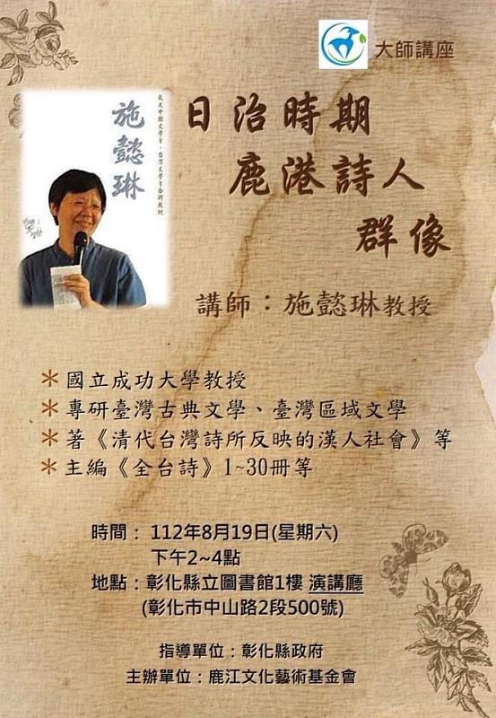 8月19日(星期六)下午2~4點在彰化縣立圖書館1樓演講廳,邀請施懿琳教授主講「日治時期鹿港詩人群像」,施懿琳教授出身鹿港,治學嚴謹,論詩、論文皆大量蒐集史料,梳理文字和古今文人對話,統整始末根源,建構臺灣文學史,主編《全臺詩》、編撰《臺灣漢詩三百首》,出版成就斐然。主要研究方向為臺灣古典文學,並專注於臺灣區域文學史研究,深入地方縣市考掘其文學發展與演述,多有參與撰寫各縣市文學史發展計畫,同時也勤於家鄉彰化的文化研究,為《新修彰化縣志》〈文化志〉主持人,研究著作豐富,2019年榮獲第21屆彰化縣磺溪文學獎特別貢獻獎得主。