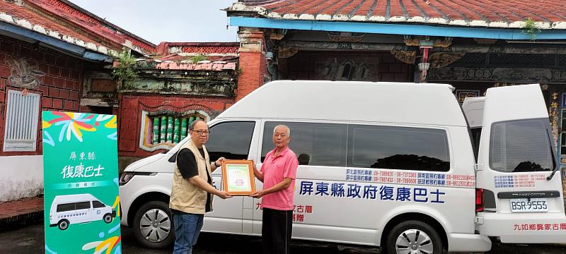 (中央社訊息服務20230817 14:10:58)復康巴士是屏東縣內身心障礙朋友最依賴的重要交通運具,龔家代表17日上午在龔家古厝,捐贈屏東縣政府1輛復康巴士,強化屏東縣復康巴士的服務量能,現場由龔家代表龔宙任親自將車鑰匙交到縣府代表林聖峯科長手上,科長也代表屏東縣政府頒發感謝狀及回贈身障者字帖,感謝龔維伯先生在屏東縣身心障礙朋友交通服務上的協助。