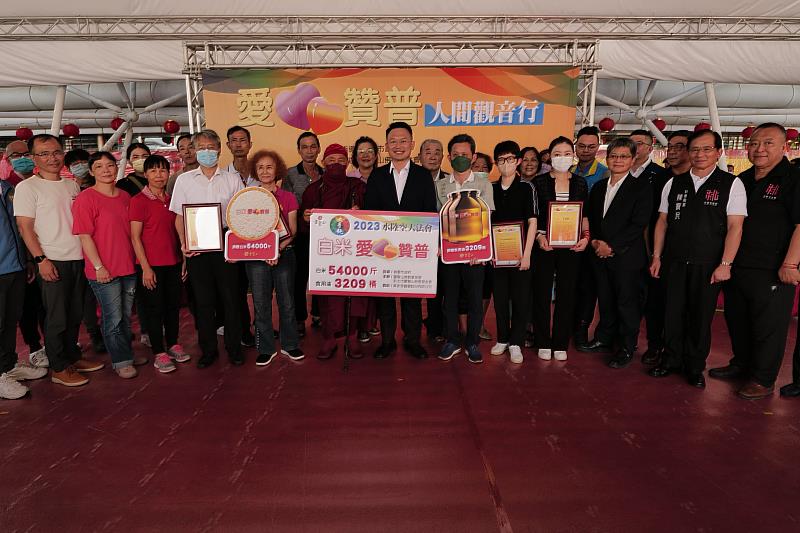 (中央社訊息服務20230822 17:13:21)千年水陸,萬世慈悲!8月22日,靈鷲山水陸法會舉辦愛心贊普感恩盛典,開山住持心道法師及桃園市府團隊,共同見證愛與善交流傳遞的時刻。今年共募得54,000公斤白米及3,209桶食用油,與新北、桃園約3,500個弱勢家庭結緣。