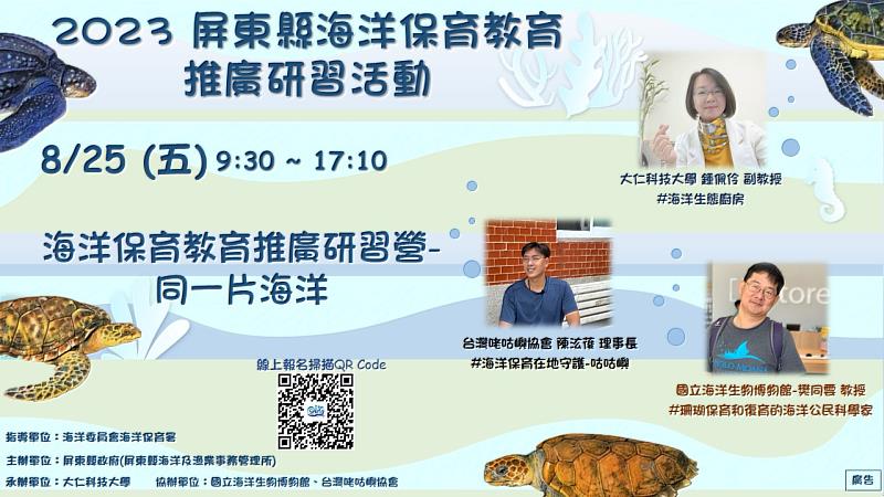 (中央社訊息服務20230823 09:52:12)屏東縣持續投入海洋保育教育,將於8月25日假大仁科技大學舉行「屏東縣海洋保育教育推廣研習活動」,活動以海洋生態廚房、海洋保育在地守護、珊瑚保育復育為主題,教導民眾學習如何參與海洋公民科學家,為海洋保育貢獻一己之力,歡迎對海洋保育抱有熱情的各界人士踴躍參與。