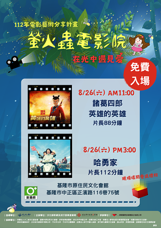 (中央社訊息服務20230824 11:12:23)由文化部指導,文化部影視及流行音樂產業局與國立新竹生活美學館共同主辦「電影藝術分享-螢火蟲電影院」計畫,8月25、26、27日將連續三日放映電影,分別於台北市北投區新奇岩社會住宅、基隆市原住民文化會館及新北市汐止夢想社區,接力上映「諸葛四郎-英雄的英雄」、「哈勇家」及「科學少女」三部精彩國片。