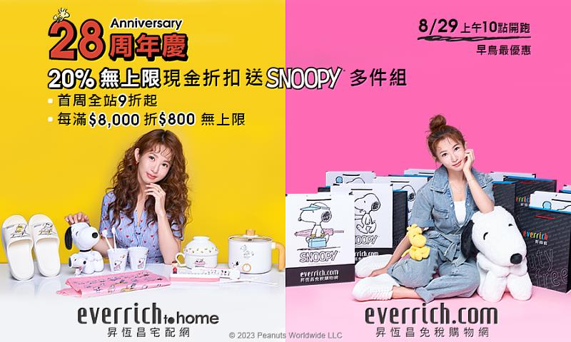 台北2023年8月24日 /美通社/ -- 隨著疫後旅遊潮及消費回溫,台灣免稅業領導品牌《昇恆昌》今(24)日正式宣布「昇恆昌28周年慶」系列活動即將熱烈展開,為刺激買氣推升再添高峰!自8月29日上午10點起,《昇恆昌免稅購物網》及《昇恆昌宅配網》搶先吹響周年慶戰局號角,聯手經典巨萌療癒系偶像「史努比SNOOPY」,推出周年慶方案:《昇恆昌免稅購物網》及《昇恆昌宅配網》全站商品9折起 + 每滿8000折800無上限,相當於20% 無上限現金折扣,且滿額再送SNOOPY限定禮多件組!