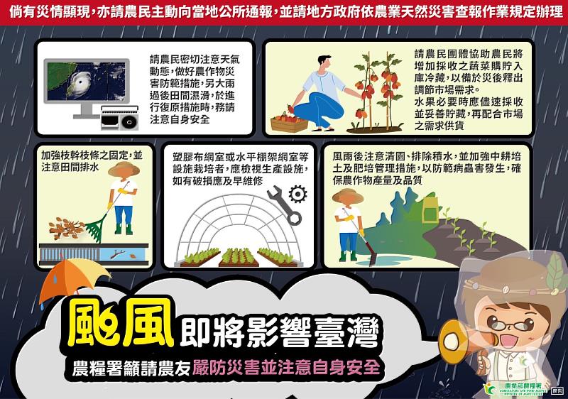 農糧署指出,該署已通報各直轄市、縣(市)政府密切注意颱風動態並宣導相關防範措施,後續倘有災情顯現,亦請農民主動向當地公所通報,並請地方政府依農業天然災害查報作業規定辦理。另外,基層公所對於災後需即時採收及復耕之受災田區作物,應動員人力進行勘查及拍照取證工作,並加強宣導農民可自行拍攝當次災害損失照片,內容應包含拍攝日期、災損情形、相鄰田區、可識別田區位置之背景及衛星定位資訊,並自行標示田區坐落地段(地號)等。後續如經公告辦理救助,應於公告受理申請救助期間內,併同申請文件送基層公所備查,作為災損認定之佐證參考資料,兼顧受災農民及時復耕及申請天然災害救助之權益。