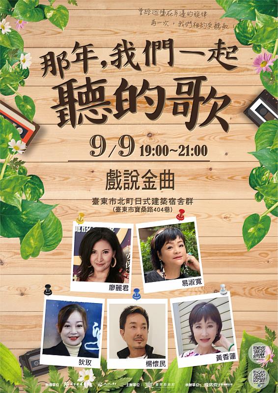 9日晚上7點邀請您帶著熱情,踏進這段穿越時光的旅程,那年,我們一起聽的歌,再次回盪在臺東的夜空。讓音樂將我們匯聚,無論年齡,共享美好的旋律。更多詳情請上Facebook粉絲團「那年,我們一起聽的歌」、「臺東縣政府文化處」查詢或致電089-350382洽詢,主辦單位保留活動異動權利,並即時公告相關訊息。