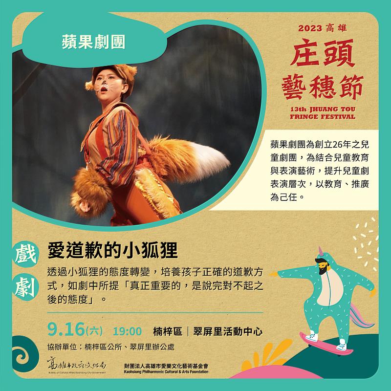 高雄市文化局為了讓偏遠地區的孩子與家庭也能欣賞到劇場等級的藝文饗宴,每年用心舉辦「庄頭藝穗節」,今年邀請到高雄在地的優秀的藝文團隊踏入偏鄉,長達近三個月、三十六場精彩的演出,各團無不使出渾身解術,搬出重量級的藝術演出,帶給觀眾難忘的藝文饗宴。而今年蘋果劇團特別於9月16日晚間7點,在高雄楠梓區的翠屏里活動中心前廣場,帶來精彩的品德歌舞劇《愛道歉的小狐狸》,帶領台下的孩子與家長,進到動物森林裡與動物們一起玩耍,學習品德。
