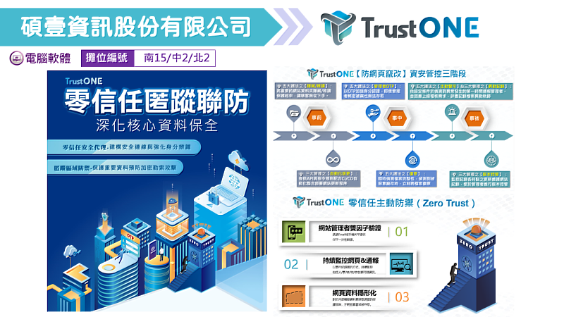 (中央社訊息服務20230915 14:17:21)由中華民國資訊軟體協會主辦的「2023創新資訊應用展示暨研討會」,預計在10月5日於高雄商務會議中心、10月13日於台中集思文心會議中心以及10月19日於集思北科大會議中心登場。參展廠商碩壹資訊股份有限公司(下簡稱TrustONE)將於北中南三場次展示及分享「零信任匿蹤聯防」等相關資安產品及議題,讓前來與會的政府機關採購、資訊人員對TrustONE的產品有更深入的了解及興趣!