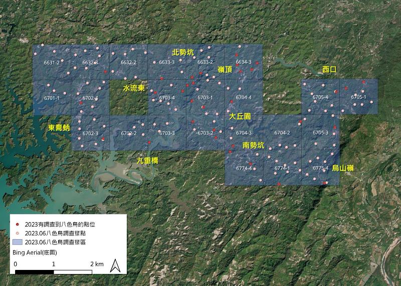 八色鳥是臺灣不普遍的夏候鳥,每年4-5月遠從東南亞來到臺灣繁殖,至同年7-8月返回,主要棲息於低海拔原始闊葉林或次生林。為瞭解臺南六甲八色鳥的族群分布現況,林業保育署嘉義分署今年首次與生物多樣性研究所、台南市野鳥學會合作執行「臺南六甲八色鳥系統化調查」,完成23個樣區145個樣點的系統化調查,共調查到50隻次的八色鳥,包含6隻次目擊紀錄、44隻次鳴叫紀錄。調查結果發現六甲北勢坑、大丘園、嶺頂、南勢坑為八色鳥核心分布區域,東膏蚋、烏山嶺亦有八色鳥零星分布,顯示八色鳥廣布於六甲淺山區域。此外今年繁殖季北勢坑棲地觀察到一對八色鳥撫育2隻幼鳥成功離巢,再次觀察到八色鳥親鳥繁殖季末期頭頂脫毛的有趣現象。