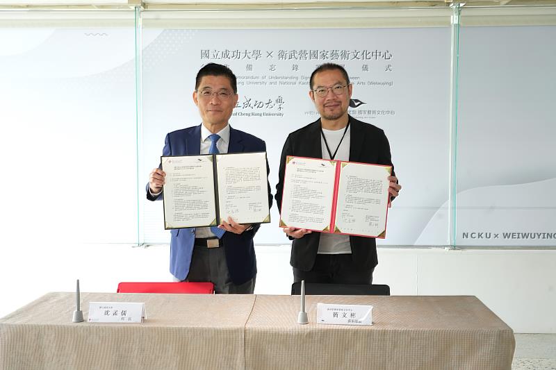 (中央社訊息服務20230921 16:38:56)國立成功大學與衛武營國家藝術文化中心今(21)日上午在光復校區,由成大校長沈孟儒與衛武營國家藝術文化中心藝術總監簡文彬共同簽署合作備忘錄。為期5年,雙方預計透過產學合作,加強學術與產業交流,共享資源及相關行政支援,促成藝術推動、人才培育及學術研究等藝術共好計畫,創造雙贏互惠的合作關係同時拓大成大師生參與的藝術生態圈。