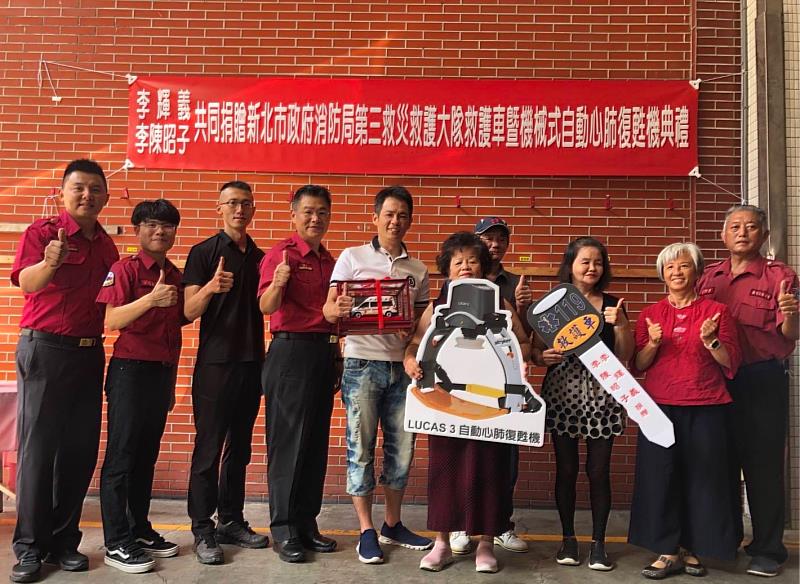 (中央社訊息服務20230925 10:54:39)為發揚無私大愛奉獻精神,並提升新北市緊急救護品質,李輝義及李陳昭子夫婦捐贈新北市政府消防局第三救災救護大隊淡水分隊高頂救護車1輛及機械式自動心肺復甦機1台,訂於112年9月25日(星期一)10時整假第三救災救護大隊淡水分隊(新北市淡水區新生街29號)辦理捐贈典禮,由第三大隊大隊長陳志德代表受贈。
