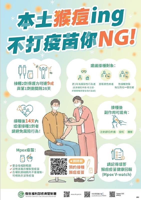 疾管署已於8月22日放寬「曾接種天花疫苗者」可接種2劑疫苗,呼籲僅接種1劑之民眾,儘速完成2劑疫苗之接種。另疫苗接種服務自7月5日起,已擴大對象為「近1年有風險性行為者(例如:多重性伴侶、性交易服務者、於營業場所發生性行為者等);過去曾罹患性病;或性接觸對象有前述任一情形者」等3種民眾。應儘速完成2劑猴痘疫苗接種,別讓猴痘(Mpox),「痘」陣來!