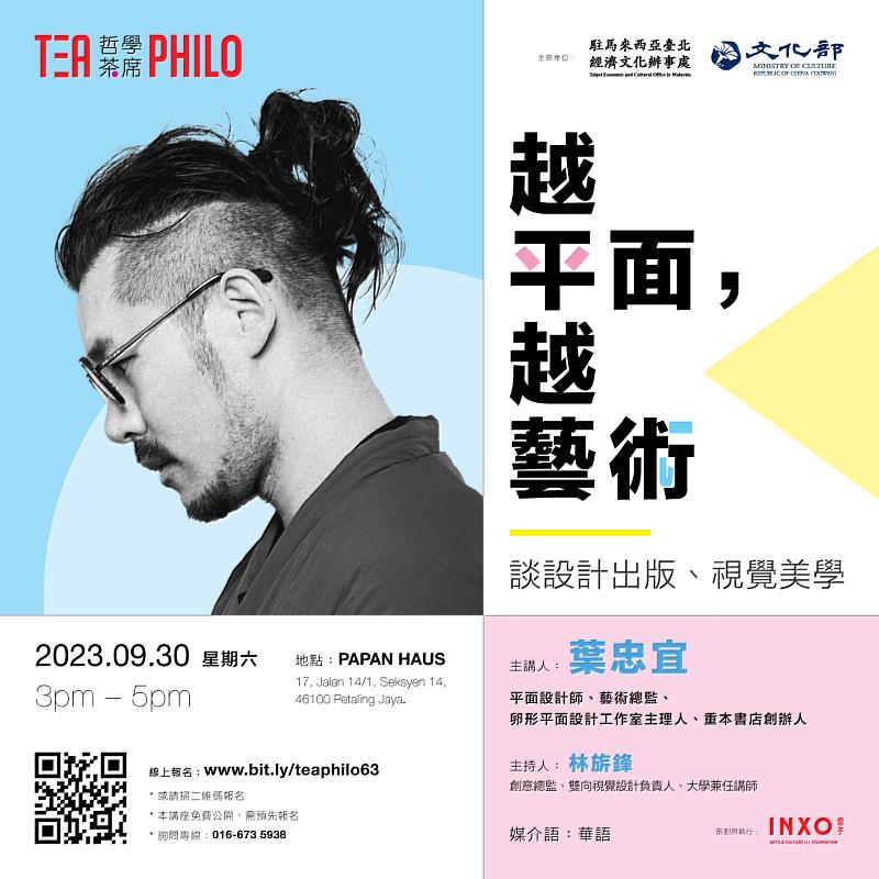 (中央社訊息服務20230925 18:09:07)駐馬來西亞代表處文化組與雲手文創基金會合辦「哲學茶席」,今年最後一講將於9月30日邀請設計師葉忠宜以「越平面、越設計」為題,既談設計教育,也聊商業設計市場新的可能性。講座由赴臺灣求學、定居、創業的「雙向視覺設計」負責人林旂鋒主持,兩人將一同聊設計出版及視覺美學,如何讓美融入生活。