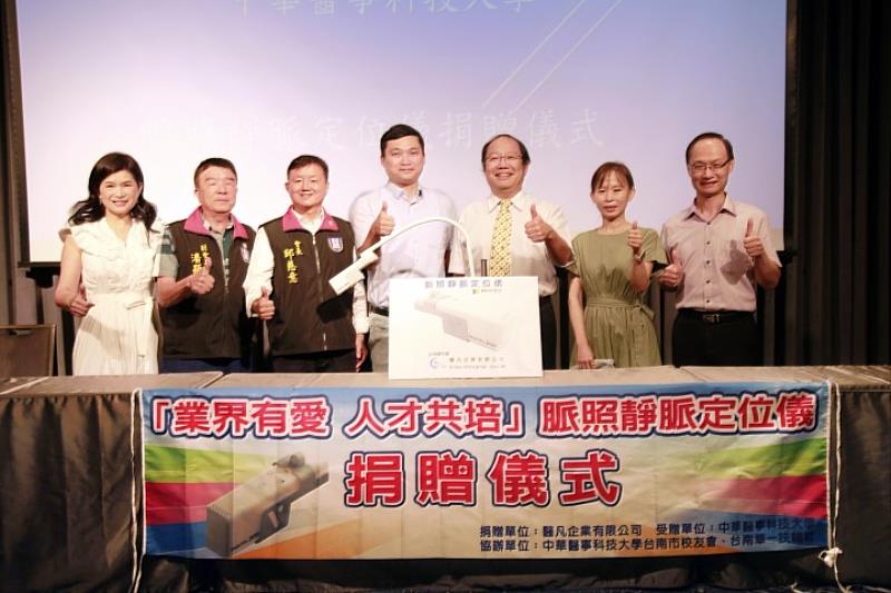 「業界有愛,人才共培」,醫凡企業有限公司捐贈兩台脈照靜脈定位儀給中華醫事科技大學護理系和醫學檢驗生物技術系,輔助學生強化針劑注射技能。校長孫逸民代表學校致贈感謝狀,並感謝居中聯繫促成這次儀器捐贈的社團法人台南縣醫事檢驗師公會、中華醫大台南市校友會和台南華一扶輪社,期許學生善用企業和校友的愛,在專業學習上精益求精,幫助更多人。