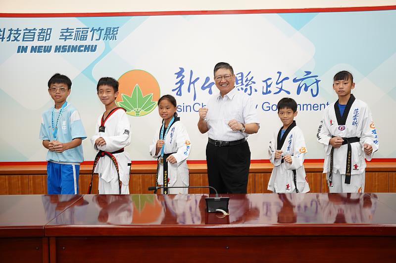 新竹縣參加112年第30屆全國少年跆拳道錦標賽大放異彩,坪林國小范雲昕、二重國中李昱洋、中山國小林語柔及二重國小洪宇頡四位好手,共踢出3銀1銅佳績。新竹縣長楊文科今(26)日在主管會報中特別頒發「榮耀新竹」獎狀,肯定四位跆拳道小將的優異表現。