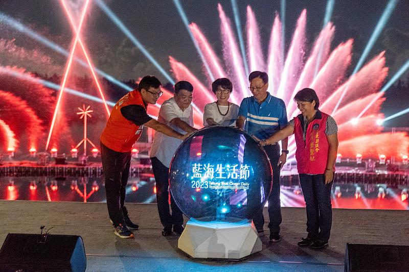 臺東縣政府於中秋連假推出2023藍海生活節,昨(28)晚在活水湖以水舞開幕,氣勢磅礡,吸引上千民眾,繽紛多彩的水舞表演及聲光效果,加上范逸臣回家開唱的熱情演出,讓現場民眾直呼太精彩了!縣長饒慶鈴表示,邁入第二年的藍海生活節,縣府持續創新,今年首次在夜間無光害的活水湖引進臺東少見的水舞展演,為活水湖帶來不同風貌,歡迎民眾於9/29-10/1活動期間來活水湖打卡、拍照分享!