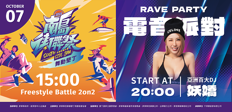 「舞動墾丁,越夜越嗨!」最南的街舞盛事將在 10 月 7 日周六下午3 時於大灣遊憩區熱鬧登場,由唱跳藝人嘻小瓜擔任主持,Freestyle Battle2on2 競賽更邀請 AMAY、古慶瑀、小慶及二巷擔任評審,現場邀集多家限定市集品牌出攤,超狂特色消暑美食齊聚,還有拍照打卡活動,晚上由亞洲百大 DJ 妖嬌接力電音派對狂歡,伴隨著陽光、大海及熱血青春,一起在台灣最南端瘋狂飆舞。交通搭乘墾丁快線可直達活動現場,距離墾丁大街也僅需步行 2 分鐘,太適合連假衝一波。