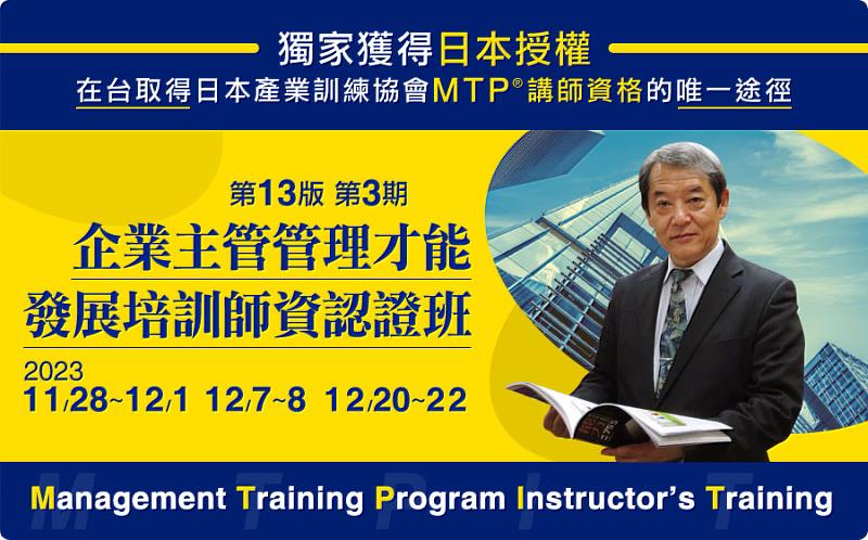 捍衛企業的權益,別讓您的知識也接受仿冒!中國生產力中心為中華民國唯一獨家獲得日本JITA(日本產業訓練協會)授權出版及訓練“MTP ”的機構,睽違3年的『MTP-I企業主管管理才能專業師資培訓班』刻正招生中,報名截止:自112年11月11日止。詳情請連結以下網址http://mymkc.com/app/edms/cpc2546/edm/2023/mtp/index.html