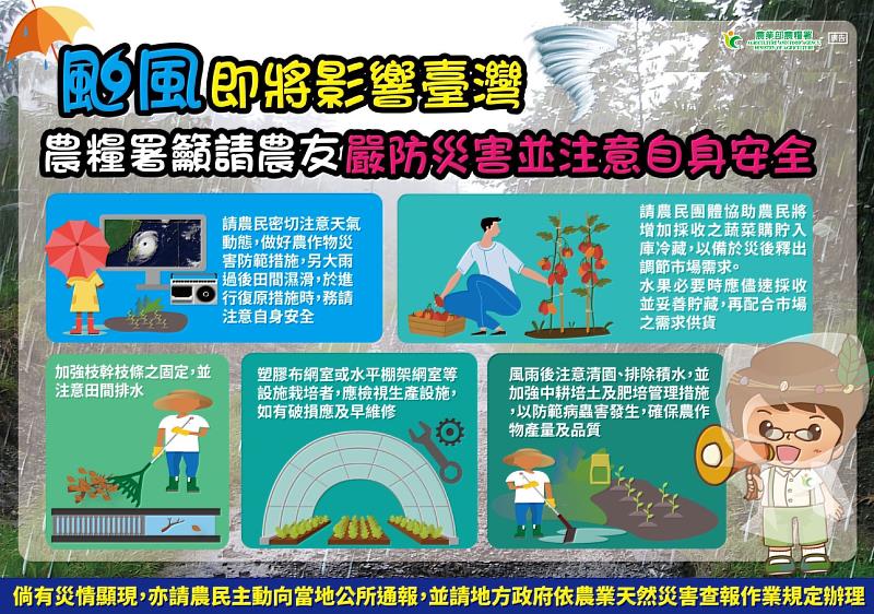 農糧署指出,該署已通報各直轄市、縣(市)政府密切注意颱風動態並宣導相關防範措施,後續倘有災情顯現,亦請農民主動向當地公所通報,並請地方政府依農業天然災害查報作業規定辦理。另外,基層公所對於災後需即時採收及復耕之受災田區作物,應動員人力進行勘查及拍照取證工作,並加強宣導農民可自行拍攝當次災害損失照片,內容應包含拍攝日期、災損情形、相鄰田區、可識別田區位置之背景及衛星定位資訊,並自行標示田區坐落地段(地號)等。後續如經公告辦理救助,應於公告受理申請救助期間內,併同申請文件送基層公所備查,作為災損認定之佐證參考資料,兼顧受災農民及時復耕及申請天然災害救助之權益。
