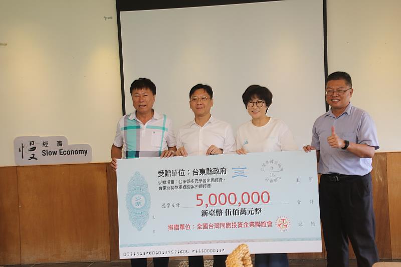 用實際行動關心、支持臺東的教育與健康照護,全國臺灣同胞投資企業聯誼會(臺企聯)發揮慷慨助人之心,今(3)日捐贈新臺幣500萬元給臺東縣,由縣長饒慶鈴代表接受,饒慶鈴表示,此次善款將幫助臺東縣內學生的教育及照護經費,如提供體育特長學生多元學習出國競賽旅費,以及做為弱勢急重症個案照護用途,也藉此鼓勵更多企業和個人參與支持臺東教育的發展,共同創造更美好的未來。