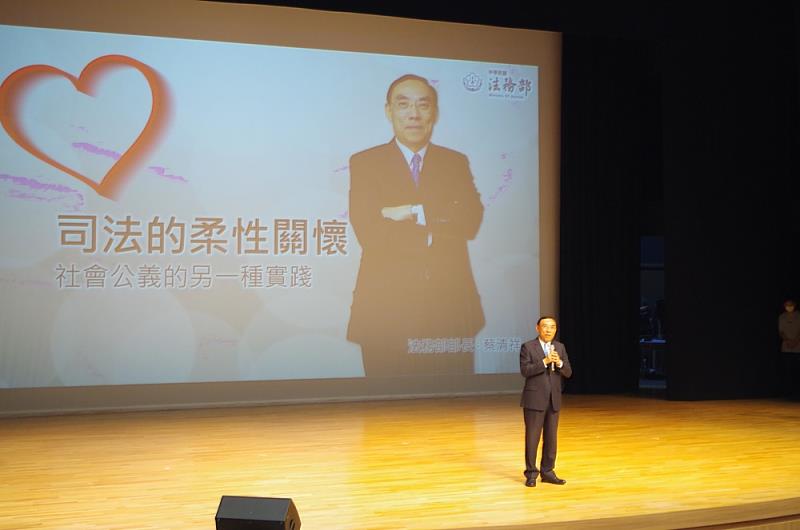 蔡部長開宗明義就提出:司法的柔性關懷,對象分作兩類人,一是被害人及其家屬,二是加害人及其家屬,對於社會的整體公義性,融合了司法的嚴厲性與對人性的關懷,更能幫助當事人重新融入社會,有助於維護社會秩序與和諧,因此蔡部長從事三十年法務工作,始終抱持著「執衡持平」的理念,務使台灣司法更趨完善。針對以上對象弱勢關懷,提供輔導協助融入社會。