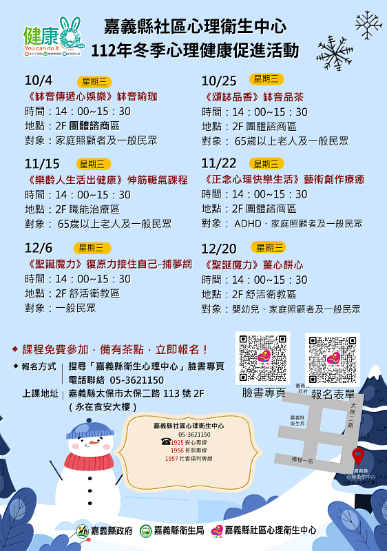 衛生局長趙紋華表示,嘉義縣社區心理衛生中心定期舉辦多元互動性課程,協助民眾學習正確的紓壓方法,冬季課程包含親子、認識自我,提升民眾心理健康促進,透過手作、正念等紓壓團體課程,歡迎民眾踴躍參加。