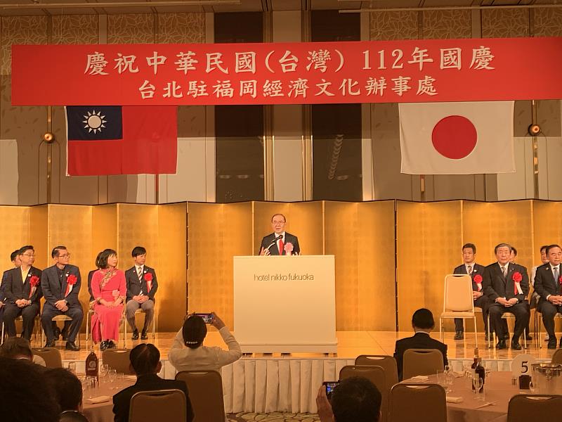 外交部駐福岡辦事處於10月6日(星期五)晚間在日航飯店舉行中華民國112年國慶酒會及各縣市美食特產展示,由陳銘俊處長主持,來賓包括日本參眾議員、九州及山口地區政、商、僑、學界領袖等約450多人,場面隆重盛大。尤其本年有20多位國會議員及130多位副知事、縣議員、市町村行政首長及100多名工商大老、各大電視台高層及多位大學校長等親臨現場祝賀外,賀電更逾80多封,各界共同見證前所未見之台日熱絡友好關係。尤其自民黨總務會長森山裕眾議員大陣仗出席現場祝賀,場內歡樂聲此起彼落,酒會氣氛喜氣歡騰,與會場外戒備森嚴形成強烈對比。另福岡歡喜合唱團獻唱雨夜花等台灣歌謠,撩起海外遊子思鄉情懷,掌聲淚水交錯。