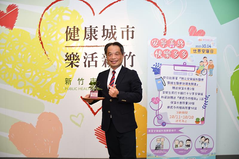 衛生局提醒,「安寧善終,快樂多多」打卡送多肉活動,在衛生局10樓左側設置打卡牆,市民只要透過打卡於自己臉書Facebook 上分享安寧緩和資訊,即可獲贈療癒多肉植栽1盆,活動自今年10月11日到10月20日止,數量有限,送完為止。另外,除了打卡活動,即日起簽署「預立安寧緩和醫療暨維生醫療抉擇意願書」並將意願書提交至衛生局10樓,可獲贈保溫水壺1個。民眾如有相關安寧緩和問題,可電洽新竹市衛生局醫政科專線(03-5355253)。