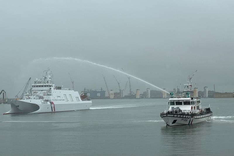 由中信造船公司打造的第7艘安平級巡防艦—萬里艦,於112年11月10日完成交船,昨(3)日自高雄港啟航,並於今(4)日順利航抵臺北港海巡基地。為迎接最新戰力,北部地區機動海巡隊(後稱北機隊)安排第二海巡隊巡防艇在港外噴水迎接,為祈求新造艦勤務順遂及人船平安,特別舉辦祈福儀式。