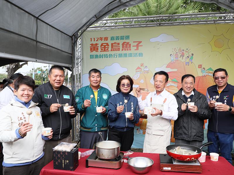 (中央社訊息服務20231223 17:03:52)嘉義縣政府與嘉義縣養殖協會合作,23日於嘉有好市集(縣府前廣場左側戀人公園)舉辦「嘉義黃金烏魚子」展售活動,縣長翁章梁、漁業署長張致盛等貴賓一同到場推廣;翁章梁也與知名廚師吳文智教授現場料理「烏魚子貢丸奶白湯」,邀請鄉親一同品嘗烏魚料理的好滋味。