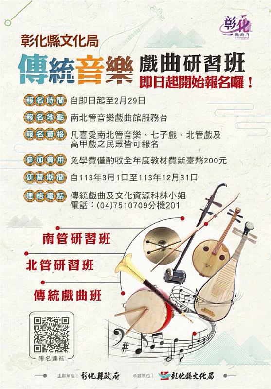 (中央社訊息服務20240126 15:17:14)彰化縣文化局113年度「傳統音樂戲曲傳習計畫」研習班開班了,自即日起至2月29日止受理報名!本研習班完全免費(僅酌收200元教材費),班級名額有限,敬請把握,歡迎所有喜愛傳統音樂戲曲的民眾踴躍參與。