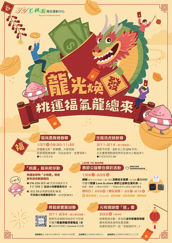 桃園國民運動中心的「龍光煥發桃運福氣 龍總來」春節活動將為市民帶來歡樂、活力、與健康的全新體驗,讓大家在新的一年裡充滿正能量,讓我們攜手迎接農曆新年,運動創造美好的回憶過好年!