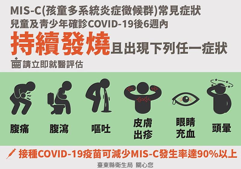 臺東縣衛生局建議家長讓0-6歲幼童、7-17歲學生族群接種COVID-19 XBB.1.5疫苗,以及時獲得保護力,降低孩童多系統炎症徵候群(MIS-C)發生風險,打造健康安心校園。