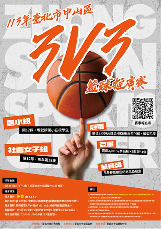 (中央社訊息服務20240509 11:30:37)中山青年盃3V3籃球賽,規劃將於6月30日(星期日)上午8時30分至下午15時30分於中山運動中心3樓多功能球場熱烈開打。