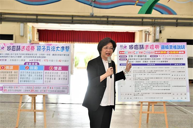 (中央社訊息服務20240514 15:09:55)彰化縣政府為鼓勵民眾癌症篩檢,今年持續辦理「做癌篩送禮券」活動,5月13日上午於彰化市平和國小活動中心辦理「做癌篩送禮券-孫子兵法大進擊」記者會,彰化縣長王惠美、彰化縣醫師公會理事長廖慶龍、彰化縣診所協會理事長林育慶及多位貴賓一同與會。王縣長表示,民眾只要設籍在彰化縣,符合衛生福利部免費提供的「子宮頸癌、乳癌、大腸直腸癌、口腔癌、肺癌及B、C型肝炎」篩檢資格者,在今(113)年1月1日至11月30日到彰化縣內27家醫院、116家診所、27家衛生所及設站篩檢現場,每完成1項篩檢者,就送100元健康禮券,最多可領600元健康禮券,而為鼓勵長輩勇於健檢,今年更是規劃「孫子兵法大進擊」策略,希望透過兒孫的溫情,帶著阿公阿嬤跟爸爸媽媽一起來做健檢!