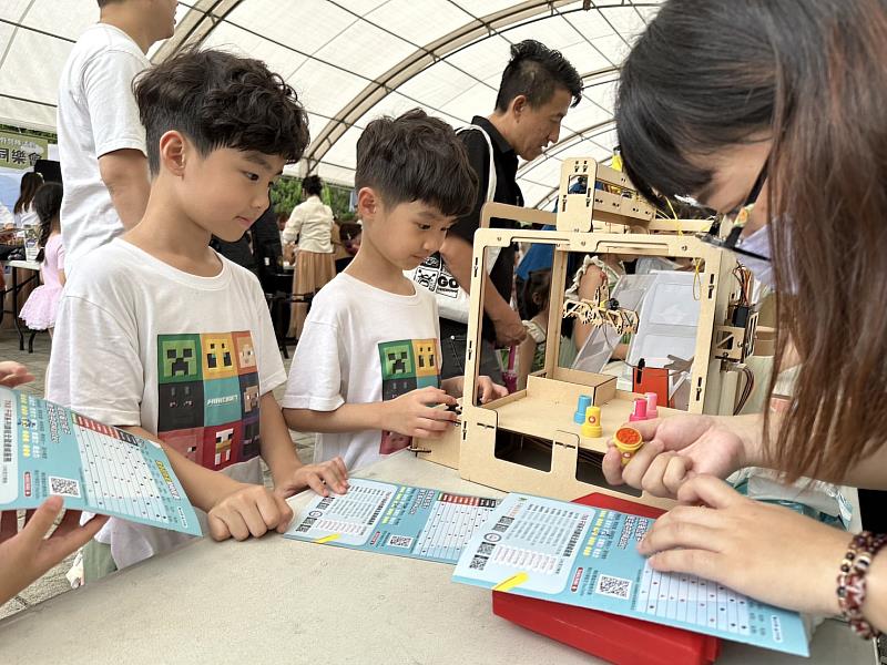 免費兒童課程體驗在本次活動中亦是一大亮點,雖然近期天氣不穩定,活動前還飄著小雨,但不減大家參與活動的熱情,活動尚未開始已有不少家庭全家排隊索取體驗券,多肉甜甜圈盆栽、太陽花吊飾、小偵探絹印等…暑期課程,讓孩子與家長們投入其中,這次也特別要請千碩文化設計益智遊戲,讓現場小朋友玩中學、學中玩,藉由參與救國團活動增進親子關係、豐富知識、樂在學習。