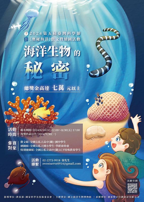 為深化大眾對海洋生物多樣性的認識及鼓勵學生透過「閱讀」探索海洋,國立海洋生物博物館(以下簡稱海生館)今年續辦「2024第五屆臺灣科學節《奧秘海洋》徵文暨繪圖活動」,參賽對象為12年國教學生與學齡前幼童,即日起徵稿至8月30日止。