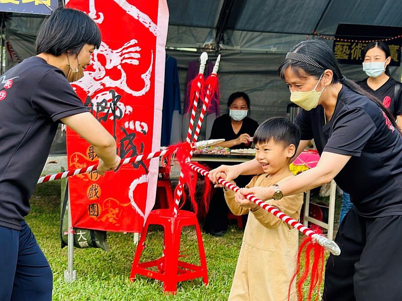 除了傍晚精彩的演出,從下午起活動現場設置戲服與妝容體驗、臺語歌謠闖關、道具教學等藝術推廣攤位,吸引許多小朋友穿上戲服拍照與學習歌仔戲的身段,藉由「演出欣賞」與「實作體驗」,增添親子互動的樂趣,讓孩童獲得全方位的學習體驗。