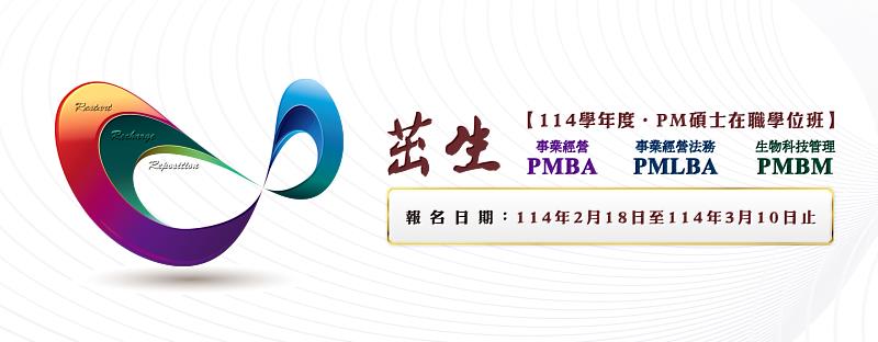 114學年度國立臺灣大學事業經營(PMBA)、事業經營法務(PMLBA)、生物科技管理(PMBM)碩士在職學位班招生簡章已公告,請有意報考者盡早關注並提前準備,以上三個班程報名時間自114年2月18日上午9時至114年3月10日晚上12時止。