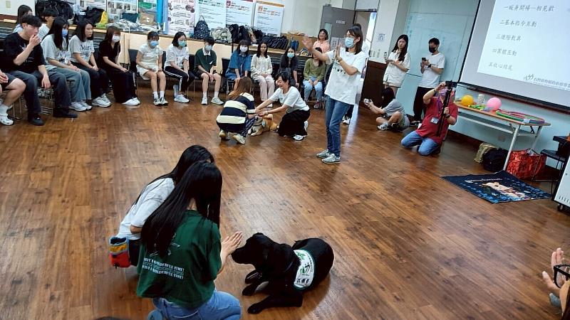 在同學們的引頸期盼下,2隻治療犬:柴犬、米克斯大黑犬現身職治系教室,現場驚呼連連。動輔師何佳芸說,柴犬是所有治療犬中定力最好的,最大特質就是可以坐著不亂動。在未聽到可以吃東西的指令前,可以耐心維持姿勢,等待並聽從動作指令;相較之下,大黑犬就沒有這麼好的定性,但能很熱情的與他人互動。治療師要引導這些治療犬協助病患前,應該要清楚了解不同治療犬的特質,如此才能達到最佳的治療效益。