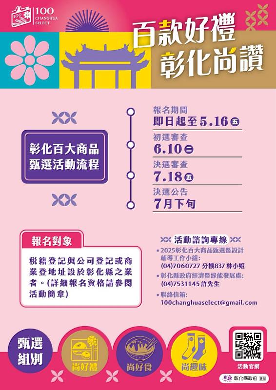 (中央社訊息服務20250508 18:11:23)彰化縣政府為響應2025台灣設計展,今年特別擴大舉辦彰化百大商品甄選活動,報名時間自即日起至5月16日。只要稅籍登記在彰化的業者,不論是常溫食品、冷藏冷凍食品或文創生活商品,均可參加。彰化縣政府表示,入選業者將獲頒「金質獎」、「優質獎」、「超威新人獎」及「網路人氣獎」等殊榮,並享有專屬官方網站曝光、展售會參與、電子宣傳手冊刊登、網紅推播及通路上架等行銷資源,以提升商品知名度和拓展市場機會,大家還等什麼,趕快報名參加!