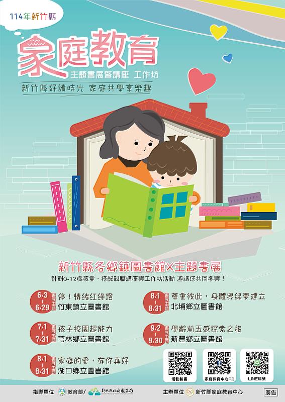 新竹縣家庭教育主題書展於各館展期為1個月,活動皆為免費,歡迎家長帶領孩子一同走進圖書館,享受親子共讀與家庭共學的美好時光。活動詳情與報名資訊請追蹤「新竹縣好讀時光‧家庭共學享樂趣」粉絲專頁(https://www.facebook.com/hccfamilyreading) ,或洽各圖書館活動海報,各場次名額有限,請盡早報名!