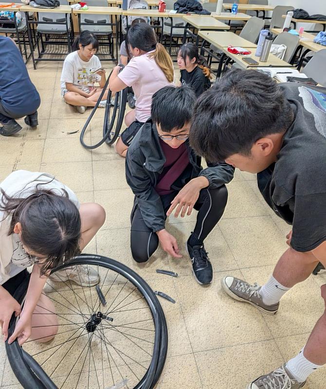 活動內容紮實,包含自行車構造認識、變速器與煞車操作、常見故障排除(如座墊高度調整、胎壓檢查與輪胎拆裝),並安排分組進行維修實作與團隊職責模擬訓練。特別設計的「領騎英語」模擬情境單元,透過角色扮演與實境練習,讓學員熟悉如何以英語進行團隊職責介紹、行程說明、安全提醒及突發事件溝通等常見對話場景,提升其於國內外旅遊服務現場的英語應對能力。