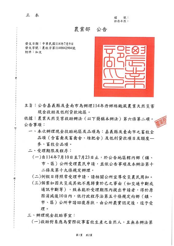 (中央社訊息服務20250709 17:37:58)農業部9日公告嘉義縣為辦理丹娜絲颱風畜牧全品項之農業天然災害現金救助及低利貸款地區,114年7月10日起至7月23日止受理申請,畜牧業者可前往畜牧場所在地公所辦理。