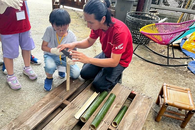 蔡惠婷老師則從生態永續角度切入,帶領學生深入瞭解台灣六大經濟竹種的特色與用途。課程中特別強調竹子在傳統建築中的關鍵角色—在鋼筋水泥問世前,竹子正是房屋骨架的主要材料。更令學童印象深刻的是,竹子作為高效碳吸收植物的環保價值,在氣候變遷議題日益受到關注的今日,讓孩子們理解竹子在環境保護上的貢獻,格外具有教育意義。