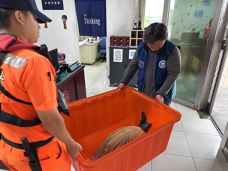 經現場測量,該隻海龜背甲長約46公分、寬約50公分,研判為保育類物種「欖蠵龜」。海巡人員與農漁局聯手,先將牠妥善安置於岐頭安檢所,並於翌(26)日交由海洋保育站人員,轉送至農業部水產試驗所澎湖漁業生物研究中心海龜收容中心進行後續照護與復原。